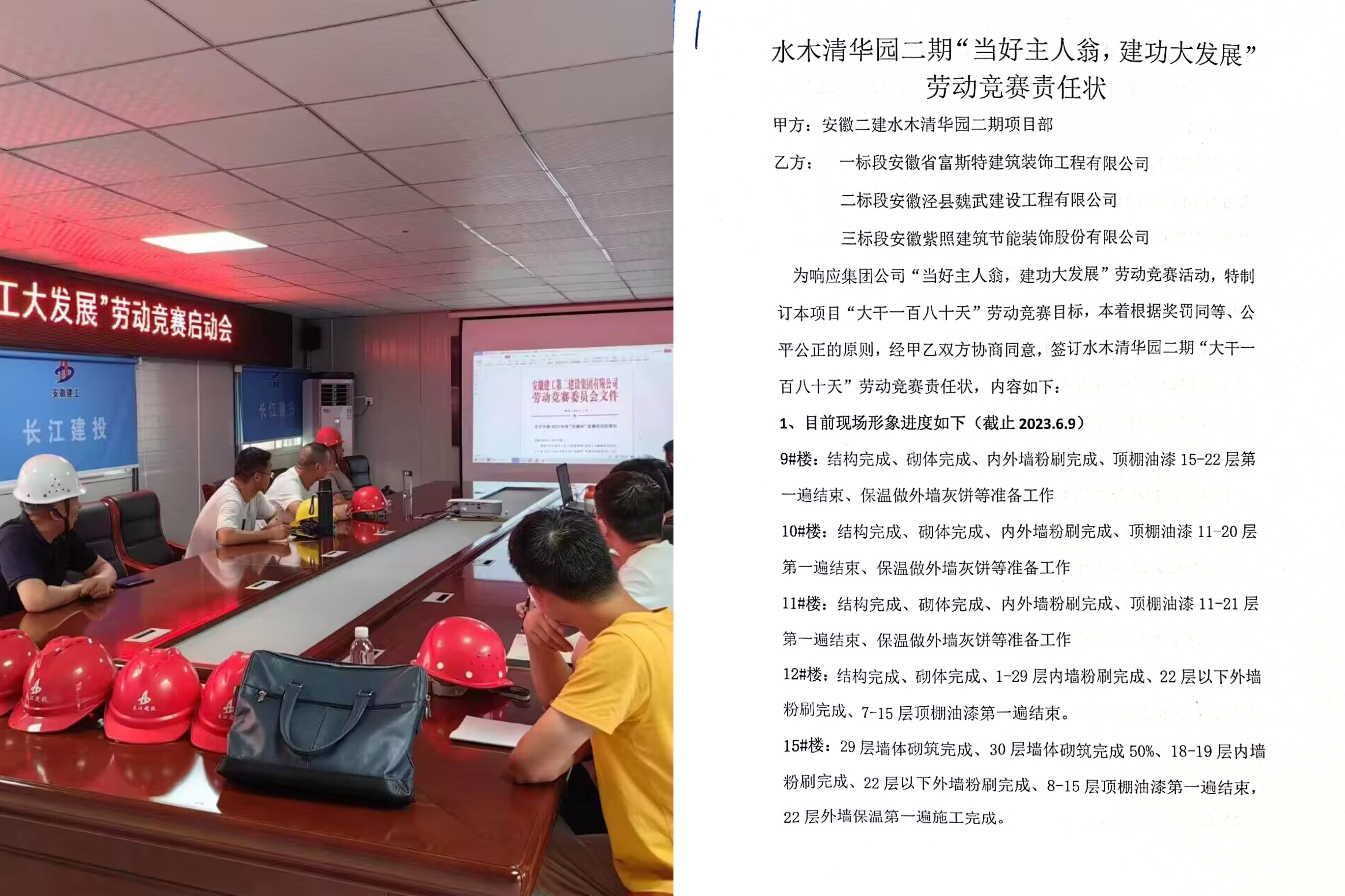 為積極響應公司“當好主人翁 建功大發展”勞動競賽號召,銅陵水木清華園二期項目部以“項目基礎管理年”活動為抓手,聚焦全年生產目標任務;以勞動精神為引領,下好先手棋,打好主動仗;以提質增效、價值創造為重點,不斷提升全員勞動生產率,形成比學趕超的濃厚氛圍,為完成勞動競賽目標任務奠定堅實基礎。