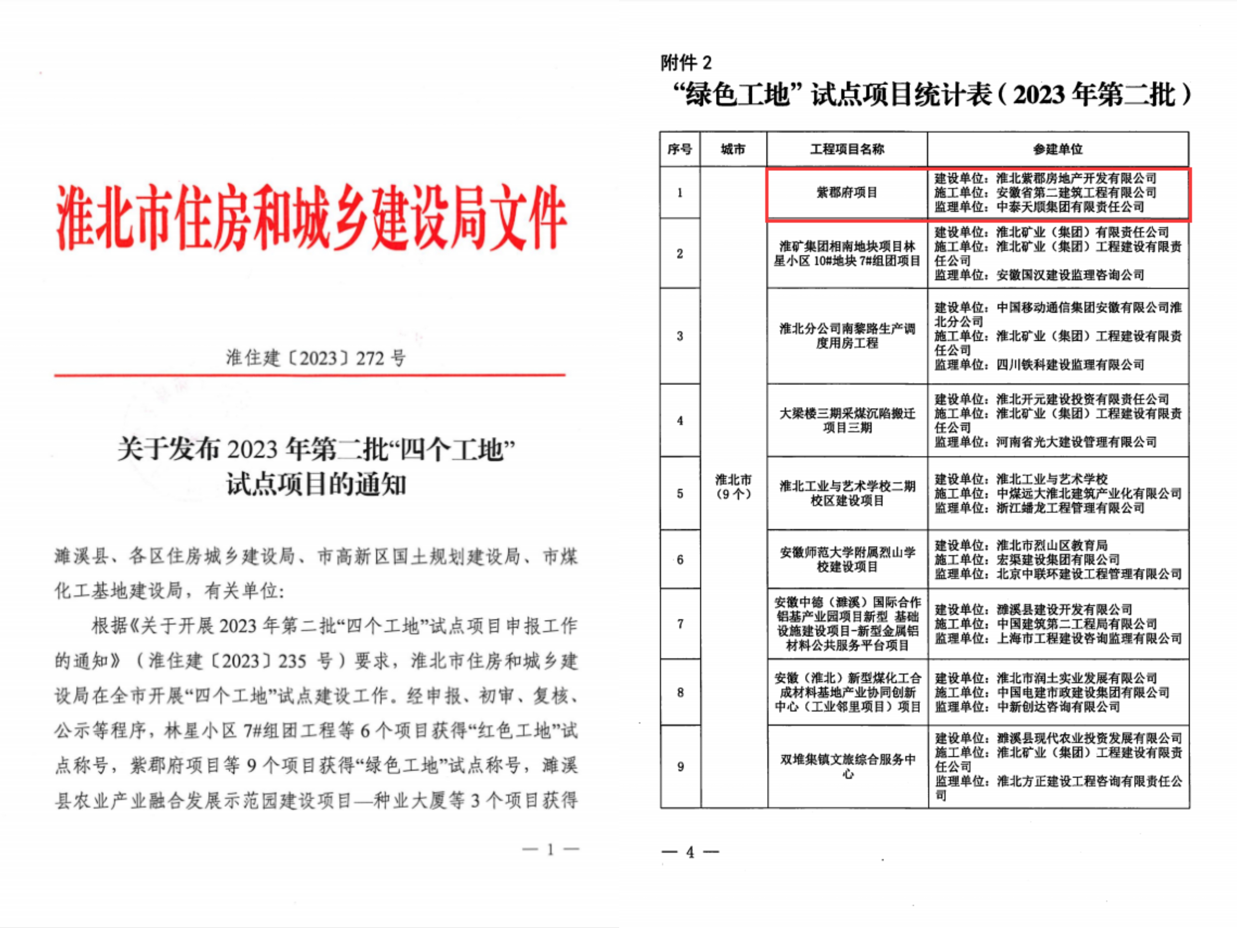 近日,淮北市住房和城鄉建設局發布了2023年第二批“四個工地”試點項目名單,建工二建第一公司承建的紫郡府項目榮獲淮北市第二批“綠色工地”試點項目稱號。
