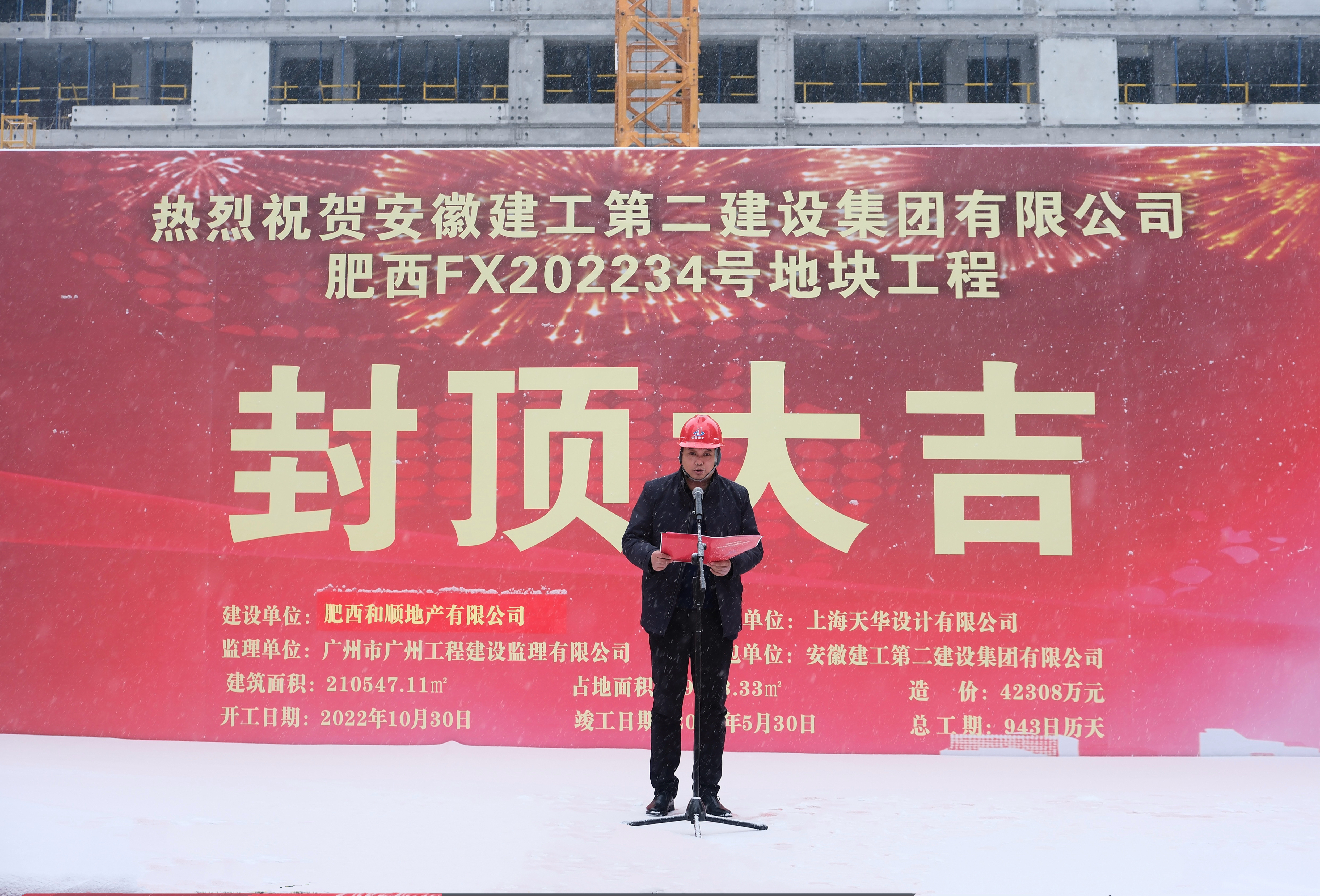 李登祥就項目建設情況做了簡要介紹,他表示:和悅云錦項目是安徽建工集團首次與央企合作的地產項目,是肥西縣滿分競品的高端住宅項目。建設過程中,我們克服了種種困境,在各方的關心支持下,與各參建單位通力協作,奮力拼搏,有力地保證了整個工程建設的穩步推進,確保了洋房主體工程如期順利封頂。我們將以洋房主體封頂為標志,再接再厲,繼續與保利、越秀、和順地產精誠合作,以飽滿的熱情、周密的組織、優質的服務確保工程進度和工程質量,如期為業主奉獻美好家園,打造“優質工程、平安工程、綠色工程、廉潔工程”,打造央地國企合作示范新標桿。