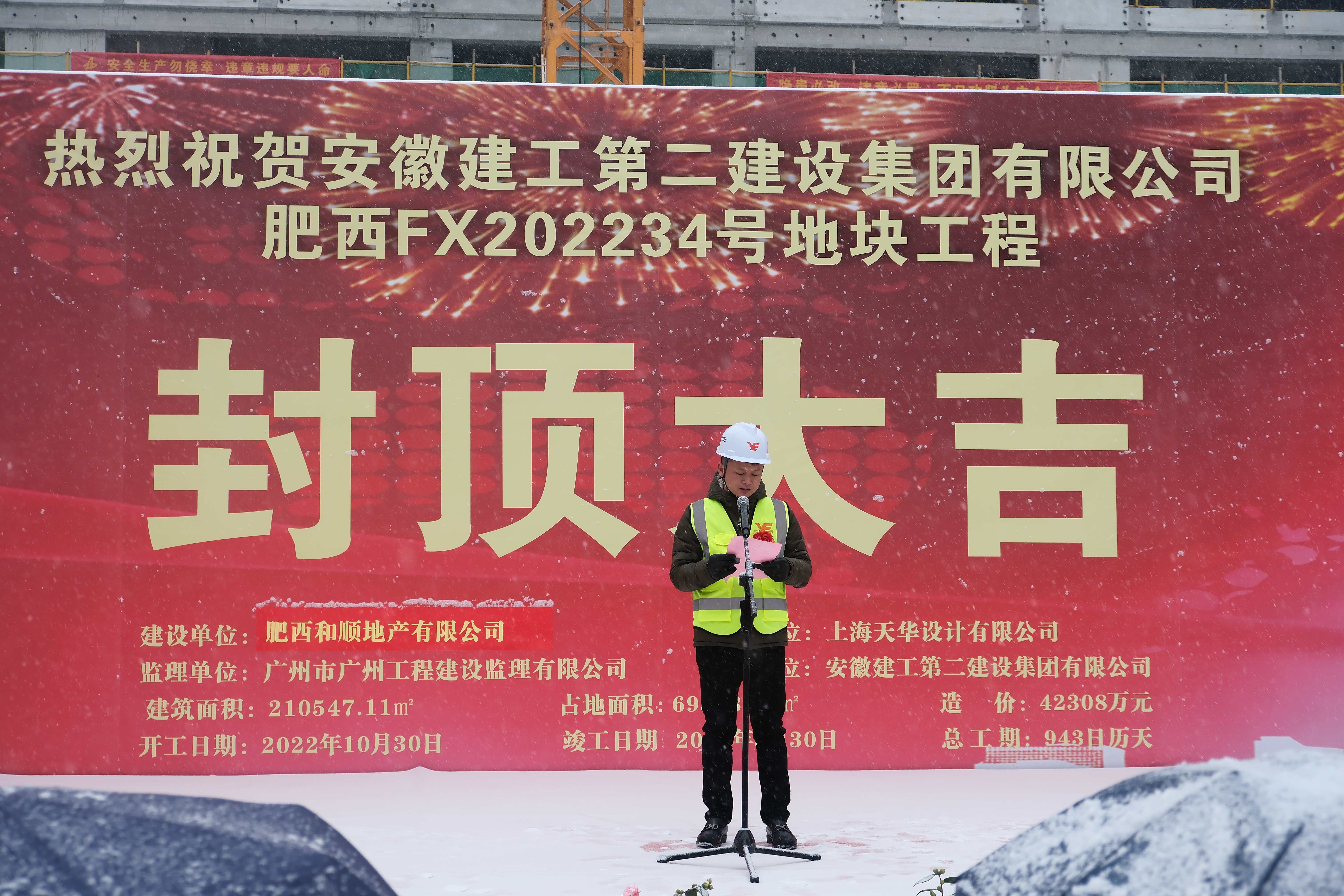 越秀地產合肥公司副總經理文彩在致辭中表示:和悅云錦項目開工以來,面臨多重挑戰,但憑借各參建單位的緊密合作和團結進取的精神,質量、進度迅速走上正軌。希望各參建方在后續的建設過程中,以高質量、高標準自驅,打磨細節,提升工程品質,把主體結構封頂當作新的起點,用高昂的斗志和百倍的信心,全力以赴完成好后續各項工作,確保項目順利竣工及高品質交付!