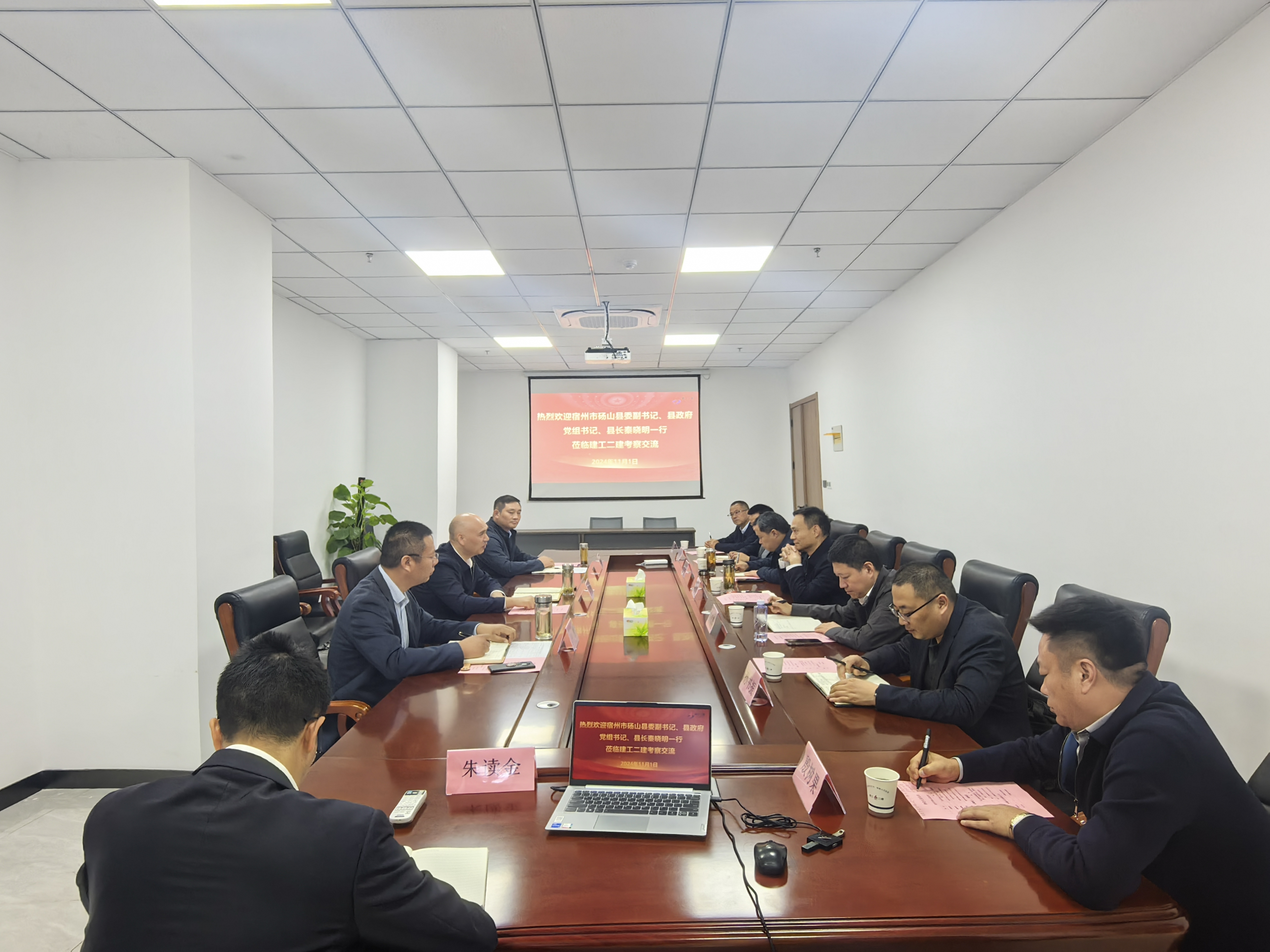 11月1日上午,碭山縣委副書記、縣政府黨組書記、縣長秦曉明一行到訪建工二建,建工股份黨委委員、副總經理,建工二建黨委書記、董事長朱忠明熱情接待并舉行工作會談。雙方就碭山縣8大重點領域工作充分交流,探討進一步擴大合作。