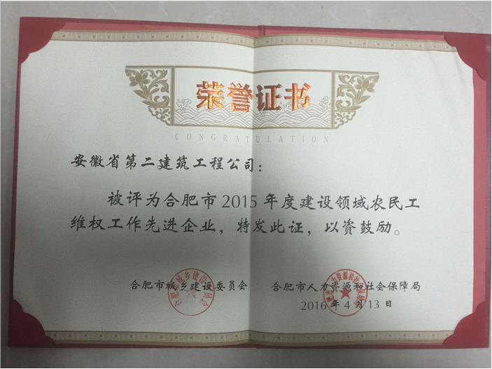 日前,在合肥市建委、合肥市人力資源和社會保障局聯合舉辦的合肥市2015年度建設領域農民工維權先進管理單位、先進企業和先進個人的評比表彰活動中,我公司被授予“建設領域農民工維權工作先進企業”稱號