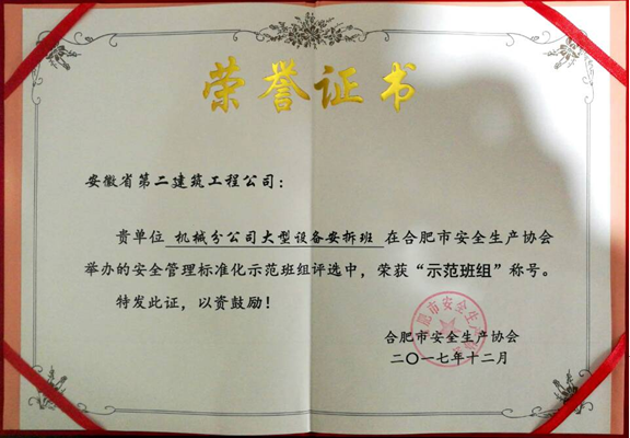 近日在合肥市安全生產(chǎn)協(xié)會第二屆第三次會員大會上傳來喜訊,機械分公司大型設(shè)備安拆班榮獲“示范班組”榮譽稱號。本次評選活動由合肥市安全生產(chǎn)協(xié)會主辦,來自市內(nèi)數(shù)十家企業(yè)的近百個班組參與評選。