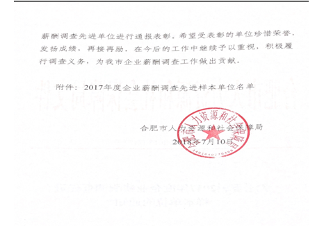 根據人力資源和社會保障部辦公廳《關于開展2017年度企業薪酬調查先進樣本單位的通知》(人社廳函【2017】68號),我公司領導高度重視,按照通知要求精心組織安排人員,以快速高效嚴謹的工作態度,圓滿完成了此次企業薪酬調查工作,得到了上級部門的充分肯定,榮獲了“2017年度企業薪酬調查先進樣本單位”殊榮。
