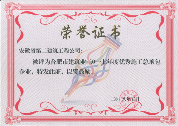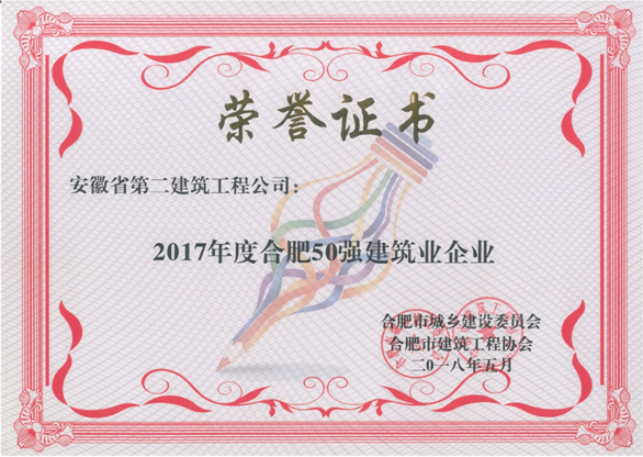 日前,公司被合肥市城鄉建設委員會、合肥市建筑工程協會授予“2017年度合肥市50強建筑業企業”、“優秀施工總承包企業”、“質量管理先進企業”、“外向輸出先進企業”、“統計管理先進企業”。徐柏林、邵善松、郭行義三名同志獲“合肥市優秀項目經理”稱號,梅紅同志獲“質量管理先進個人”稱號,周俊同志獲“起重設備安裝管理先進個人”稱號。