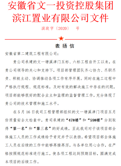 安徽二建文一·塘溪津門(mén)五標(biāo)項(xiàng)目管理團(tuán)隊(duì)堅(jiān)持疫情防控與復(fù)工復(fù)產(chǎn)兩手抓、兩手硬,管理團(tuán)隊(duì)齊心協(xié)力、盡職盡責(zé)、積極主動(dòng),保質(zhì)保量完成施工任務(wù)。在5月16日安徽省文一投資控股集團(tuán)濱江置業(yè)有限公司工程管理部組織的五月份質(zhì)量安全大檢查中,“47#樓”取得第一名的好成績(jī),獲建設(shè)單位通報(bào)表?yè)P(yáng)。