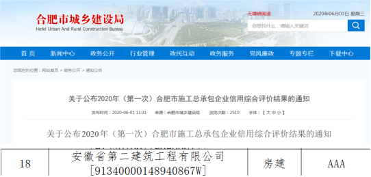 近日,在合肥市城鄉建設局網站關于公布2020年(第一次)合肥市施工總承包企業信用綜合評價結果的通知中,安徽二建公司在房建專業信用綜合評價獲得AAA級信用企業,在454家參評企業中總排名第18名,市政專業信用綜合評價獲得AA級信用企業,在331家參評企業中總排名第27名。此次合肥市施工總承包企業信用綜合評價準備工作,由公司市場管理部牽頭,相關部門及所屬各單位配合,歷時一年時間。房建專業AAA級信用企業的獲得,有助于公司在合肥市場的公開招投標。