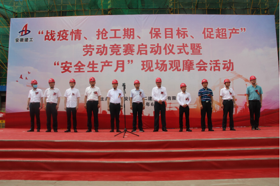 6月18日上午,安徽二建公司“戰(zhàn)疫情、搶工期、保目標(biāo)、促超產(chǎn)”勞動(dòng)競(jìng)賽啟動(dòng)儀式在淮北國(guó)金華府(紫麟苑)項(xiàng)目現(xiàn)場(chǎng)舉行。淮北市住建局唐成營(yíng)處長(zhǎng)、副處長(zhǎng)張喜明、質(zhì)監(jiān)站徐棟副站長(zhǎng)、淮北市相山區(qū)住建局呂鵬宇局長(zhǎng)、淮北國(guó)金置業(yè)有限公司董事長(zhǎng)許偉應(yīng)邀出席儀式。公司領(lǐng)導(dǎo)班子成員、機(jī)關(guān)相關(guān)部門人員及所屬各單位主要領(lǐng)導(dǎo)、分管安全領(lǐng)導(dǎo)等共計(jì)150余人參加活動(dòng),工會(huì)女工主任王俊主持啟動(dòng)儀式。