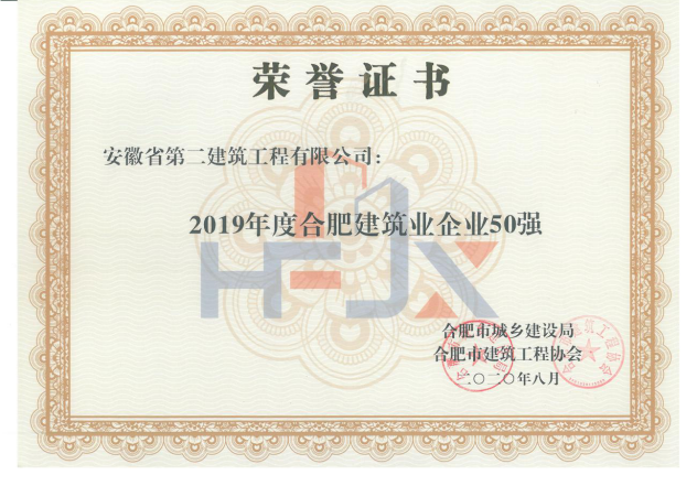 日前,公司被合肥市城鄉建設局、合肥市建筑工程協會授予“2019年度合肥市50強建筑業企業”、“優秀施工總承包企業”、“質量管理先進企業”、“安全管理先進企業”、“外向輸出先進企業”、“優秀起重設備安裝工程專業承包企業”稱號。祝超、詹濤、虞捷三名同志獲“合肥市優秀項目經理”稱號。