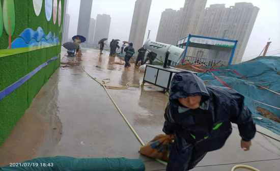 截至2021年7月20日17時許,大雨依舊沒有停歇,但項目人員沒有絲毫緊張,因為我們做好了充足的準備,防汛工作段段有人管、層層有人抓、工作有檢查、任務有安排,全力作答防汛“考卷”,保障公司財產和項目參戰人員的安全。