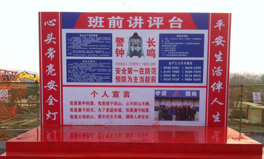 在項目施工現(xiàn)場,坐落著一塊長5米、寬2米的宣傳板,上方寫著班前講評臺,左右各寫“心頭常亮安全燈”“平安生活伴人生”的字樣。這是三分公司宿松安建龍溪山莊項目部工地開展的施工前安全教育活動。