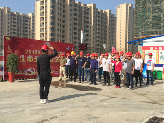 上午8點,項目經理張尚禮傳達了公司關于開展安全生產月主題及宣誓活動的精神,對活動提出了要求。隨后專職安全員劉振中帶領項目全體員工莊嚴地舉起右手鄭重宣誓,并在“生命至上,安全發展”橫幅上簽字。