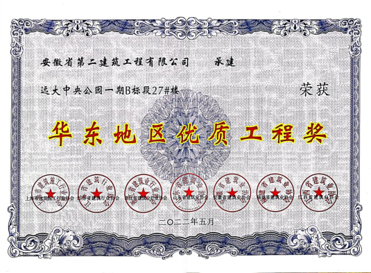 近日,由安徽二建公司承建的“舒城遠(yuǎn)大中央公園工程一期B標(biāo)27#樓”工程被授予了“2021年度‘華東地區(qū)優(yōu)質(zhì)工程獎(jiǎng)’”榮譽(yù)稱號(hào)。